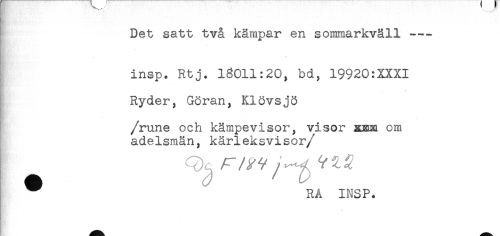 //// Det satt två kämpar en sommarkväll -- //// insp. Rtj. 13011:20, bd, 19920:XXXI //// Ryder, Göran, Klövsjö //// /rune och kämpevisor, visor 3HEEa om //// adelsmän, kärleksvisor //// /1) r/y^/^ ^ //// ^ RA INSP. ////