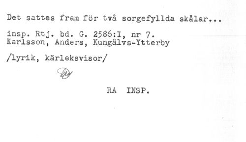 //// Det sattes fram för två sorgefyllda skålar... //// insp. Rtj. bd. G. 2586:1, nr 7. //// Karlsson, Anders, Kungälvs-Ytterby //// /lyrik, kärleksvisor //// /RA INS P. ////