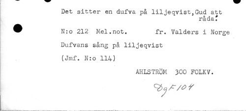 //// Det sitter en dufva på liljeqvist,Gud att //// råda? //// ^ N:o 212 Mel.not. fr. Valders i Norge //// Dufvans sång på liljeqvist //// (Jmf. N:o 114) //// AHLSTRÖM 300 FOLKV. ////
