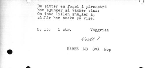 //// De sitter en fogel i päronaträ //// han sjunger så vacker visa: //// Om inte lillen snäller ä, //// så får han smaka på rise. //// S. 15. 1 str. Vaggvisa //// ^ HARBE MS SVA kop ////