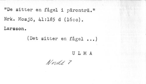 //// "De sitter en fågel i päronträ." //// Nrk. Mosjö, 41:185 d (l6:o). //// Larsson. //// < f //// (Det sitter en fågel ...) //// U L M Å ////