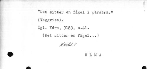 //// "Det sitter en fågel i päraträ." //// t * //// (Vaggvisa). //// Ögl. Ydre, 9^33, s.41* //// , (Det sitter en fågel...) //// U L M A ////