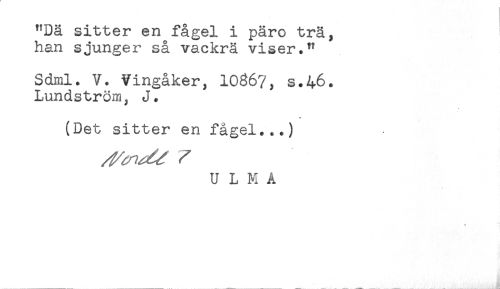 //// "Dä sitter en fågel i päro trä, //// han sjunger så vackra viser." //// Sdml. V. Vingåker, 1036?, s.46. //// Lundström, J. //// (Det sitter en fågel...) //// U L M A ////