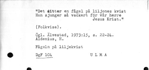 //// "Det ditter en fågel på liljones kvist //// Han sjunger så vackert för vår herre //// Jesus Krist," //// * * //// (Folkvisa). //// - * //// Ögl. Älvestad, 1973;15, s. 22-24+ //// Aldenius, H. //// Fågeln på liljekvist //// ^ DgF 104 U L M A ////