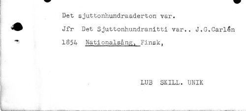 //// Det sjuttonhundraaderton var. //// Jfr Det Sjuttonhundranitti var.. J.G.Carlån //// t //// ! //// 1354 Nationalsång, Finsk. //// LU3 SKILL. UNIK ////