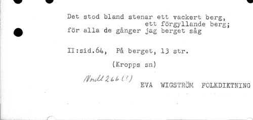 //// ^ Det stod bland stenar ett vackert berg, //// ett förgyllande berg; //// ^ för alla de gånger jag berget såg //// II:sid.64; På berget, 13 str. //// (Kropps sn) //// EVA WIGSTROM FOLKDIKTNING //// * ////