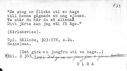 //// "De stog en flicka uti en hage //// till henne gågnade en ung sjöman. //// Va står du här du så allenaZ //// Ditt järta kan jag väl få äga." //// (Kärleksvisa). //// Upl. Hållnäs, 303:573, s.24* //// Hesselman. //// i //// ' - ^ //// * //// (Det gick en jungfru uti en hage..) ////