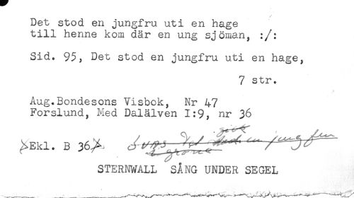 //// Det stod en jungfru uti en hage //// till henne kom där en ung sjöman, :/: //// Sid. 9$, Det stod en jungfru uti en hage, //// 7 str. //// Aug.Bondesons Visbok, Nr 47 //// Forslund, Med Dalälven 1:9, nr 36 //// ^Ekl. B 36^ ^^^^^^ ^ //// STERNWALL SÅNG UNDER SEGEL //// * ////