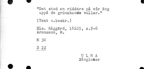 //// "Det stod en riddare på vår äng //// uppå de grönskande vallar." //// (Text o.beskr.) //// .. //// Dis. Råggärd, 16105, s.5-6 //// Aronsson, M. //// M 30 //// D 22 ////