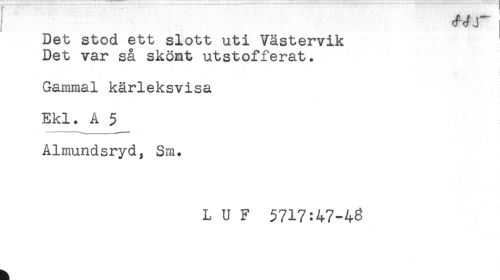 //// Det stod ett slott uti Västervik //// Det var så sköat utstofferat. //// Gammal kärleksvisa //// Ekl. A 5 //// Almundsryd, Sm. //// L U F 5717:47-43 ////