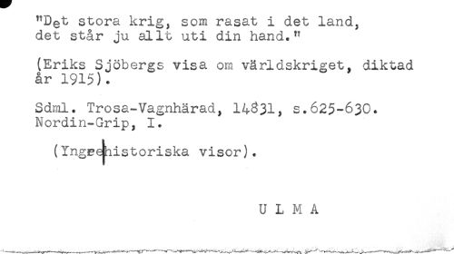 //// "D^t stora krig, som rasat i det land, //// det står ju allt uti din hand." //// (Eriks Sjöbergs visa om världskriget, diktad //// år 1915) . //// Sdml. Trosa-Vagnhärad, 14^31, s.625-630. //// Nordin-Grip, 1. //// (Yngrejhistoriska visor). //// U L M A ////