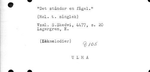 //// "Det ståndar en fågel." //// (Mel. t. sånglek) //// Vsml. S.Skedvi, 4477, s. 20 //// Lagergren, E. //// (Eåkmelodier) ^ //// U L M A ////