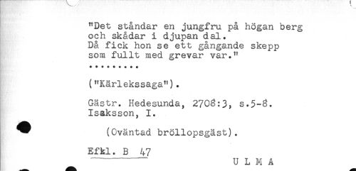 //// "Det ståndar en jungfru på högan berg //// och skådar i djupan dal. //// Då fick hon se ett gångande skepp //// som fullt med grevar var." //// ("Kärlekssaga"). //// Gästr. Hedesunda, 2708:3, s.5-8. //// Isaksson, 1. //// ^ (Oväntad bröllopsgäst). //// Efkl. B 47 //// U L M A ////