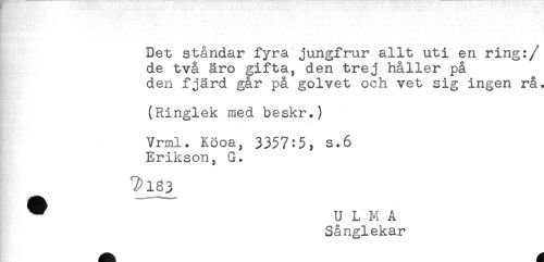 //// .... . . .. - - - //// Det ståndar fyra jungfrur allt uti en ring: //// /de två äro gifta, den trej håller på //// den fjärd går på golvet och vet sig ingen rå< //// (Ringlek med beskr.) //// Vrml. Köoa, 3357:5, s.6 //// Erikson, G. //// T>183 //// ^ U L M A //// Sånglekar ////