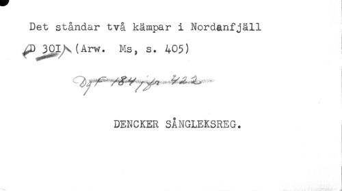 //// ! //// Det ståndar två kämpar i Nordanfjäll //// ^D JgL^ (Arw. Ms, s. 405) //// < //// i //// t //// DENCKER SÅNGLEKSREG. ////