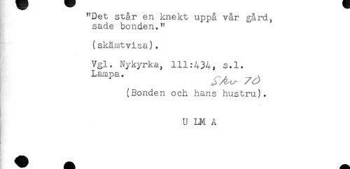 //// "Det står en knekt uppå vår gård, //// sade bonden." //// (skämtvisa). //// Vgl. Nykyrka, 111:434, s.l. //// (Bonden och hans hustru). //// U LM A ////
