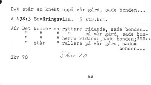 //// Det står en knekt uppå vår gård, sade bonden... //// A 43^:3 Beväringsvisa. 3 str.kom. //// Jfr Det kommer en ryttare ridande, sade bonden.. //// " " " " på vår gård, sade bon- //// " " " herre ridande,sade bondeni^en.. //// " står " rallare på vår gård, sades //// bonden... //// Skv 70 ^ ^^ //// RA ////
