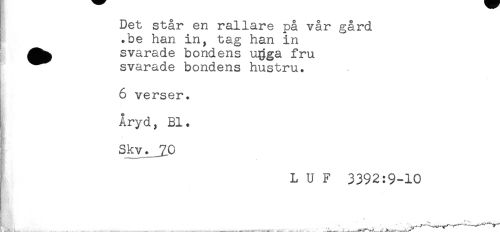 //// I Det står en rallare på vår gård //// .be han in, tag han in //// ^^ svarade bondens upga fru //// ^^ svarade bondens hustru. //// 6 verser. //// i Åryd, Bl. //// Skv. ZO //// L U F 3392:9-10 //// ! . i . . .. ___.. .. . j ////