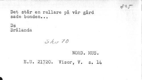//// Det står en rallare på vår gård //// sade bonden... //// - //// Ds //// Brålanda //// , < //// < //// NORD. MUS. //// < //// E.U. 21720. Visor, V. s. 14 //// ) ////