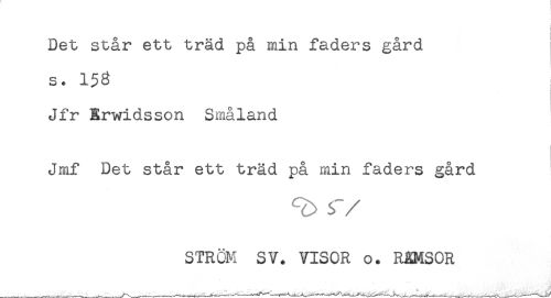 //// Det står ett träd på min faders gård //// s. 158 //// Jfr Erwidsson Småland //// Jmf Det står ett träd på min faders gård //// STRÖM SV. VISOR o. REMSOR ////