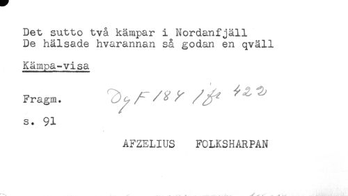 //// Det sutto två kämpar i Nordanfjäll //// De hälsade hvarannan så godan en qväll //// Kämpa-visa //// Fragm. " ' ^ //// s. 91 //// AFZELIUS FOLKSHARPAN ////