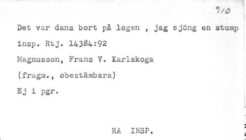 //// ! //// Det var dans bort på logen , jag sjöng en stump //// insp. Rtj. 143^4:92 j //// i //// Magnusson, Frans V. Karlskoga //// (fragm., obestämbara) //// Ej i pgr. //// ! //// - //// r //// * //// ) //// t //// RA INSP. : ////