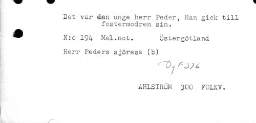 //// Det var dan unge herr Peder, Han gick till //// fostermodren sin. //// ^ N:o 194 Mel.not. Östergötland //// Herr Peders sjöresa (b) //// AHLSTRÖM 300 FOLKV. ////