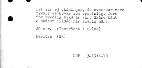 //// Det var ej skåningar, de svenskar voro //// tyvärr de bovar som brottsligt foro //// ^ för fredlig bygd är vårt Skåne känt //// ^ o sådant illdåd har aldrig hänt. //// ! 20 str. (Postrånet i Skåne) //// ! //// Harlösa (Sk) //// Sfi //// LUF 3419:4-10 //// { //// - ////
