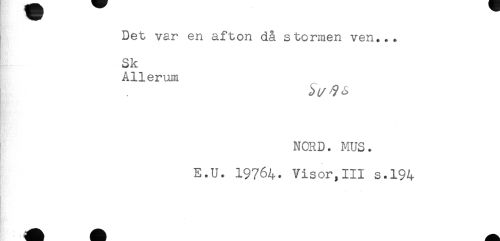 //// Det var en afton då stormen ven... //// Sk //// Allerum //// NORD. MUS. //// E.U. 19764. Visor,III s.194 ////