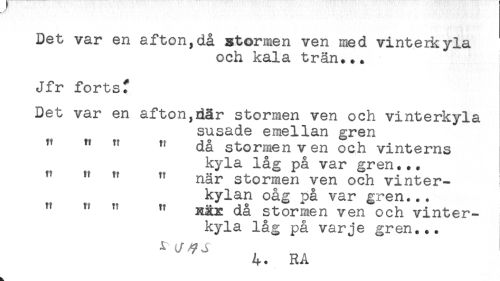 //// Det var en afton,då stormen ven med vinterkyla //// och kala trän... //// Jfr fortsf //// Det var en afton,dar stormen ven och vinterkyla //// susade emellan gren //// " " " " då stormen v en och vinterns //// kyla låg på var gren... //// " " " när stormen ven och vinter- //// kylan oåg på var gren... //// ^ ^ " Käx då stormen ven och vinter- //// kyla låg på varje gren... //// 4. RA ////