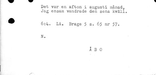 //// Det var en afton i augusti månad, //// I Jag ensam vandrade den sena kväll. //// ! //// ^ 6:4. LA. Brage 5 s. 65 nr 57. //// % //// t //// N. //// ÅBO //// * ////
