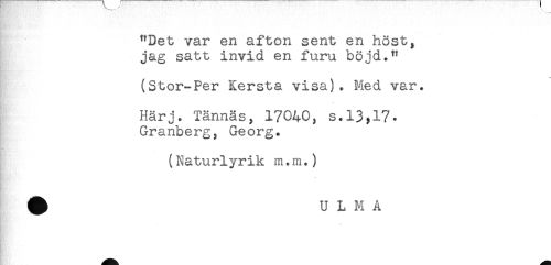 //// "Det var en afton sent en höst, //// jag satt invid en furu böjd." //// (Stor-Per Kersta visa). Med var. //// Härj. Tännäs, 17040, s.l3;17* //// Granberg, Georg. //// (Naturlyrik m.m.) //// # U L M A ////