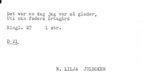 //// Det var en dag jag var så gläder, //// Uti min faders örtagård //// Ringl. 27 1 str. //// D 21 //// N. LILJA JULBOKEN //// t ////