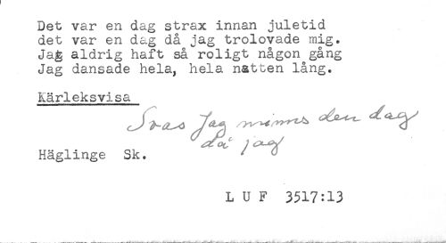 //// Det var en dag strax innan juletid //// det var en dag då jag trolovade mig. //// Jag aldrig haft så roligt någon gång //// Jag dansade hela, hela natten lång. //// Kärleksvisa //// Häglinge Sk. / <3 //// L U F 3517:13 ////