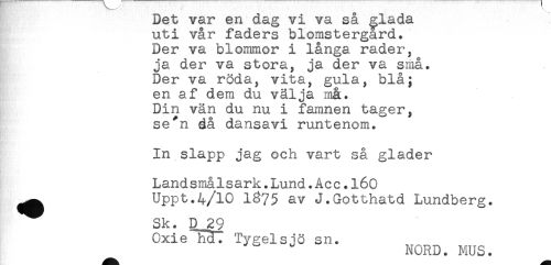 //// Det var en dag vi va sa ^lada //// uti vår faders blomstergård. //// Der va blommor i långa rader, //// ja der va stora, ja der va små. //// Der va röda, vita, gula, blå; //// en af dem du välja m&. //// Din vän du nu i famnen tager, //// se*n då dansavi runtenom. //// In slapp jag och vart så gläder //// Landsmålsark.Lund.Acc.160 //// ^ Uppt.4/10 1875 av J.Gotthatd Lundberg. //// Sk. D 29 //// Oxie hdl Tygel sjö sn. //// ^ NORD. MUS. ////