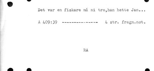 //// HR //// Det var en fiskare må ni tro,han hette Jan... //// A 409:39 ----- 4 str. fragm.not. //// . //// - //// RA ////