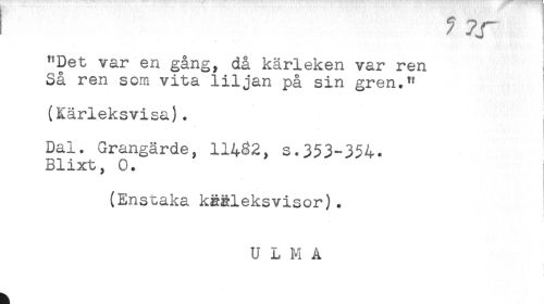 //// "Det var en gång, då kärleken var ren //// Så ren som vita liljan på sin gren." //// (Kärleksvisa). //// Dal. Grangärde, 11482, s.353-354. //// Blixt, 0. //// i //// (Enstaka kärleksvisor). //// U L M Å ////