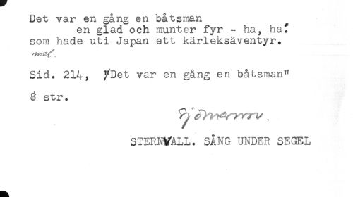 //// Det var en gång en båtsman //// en glad och munter fyr - ha, hat //// som hade uti Japan ett kärleksäventyr. //// Sid. 214, /Det var en gång en båtsman" //// 3 str. //// STERNVALL. SANG UNDER SEGEL ////