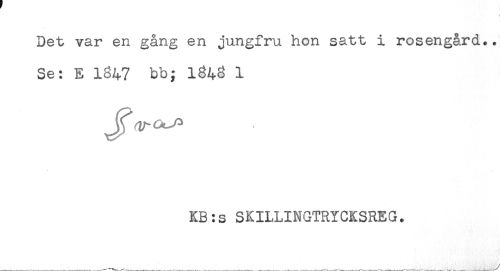 //// s //// Det var en gång en jungfru hon satt i rosengård.. //// Se: E 1847 bb; 1848 1 //// KB:s SKILLINGTRYCKSREG. ////