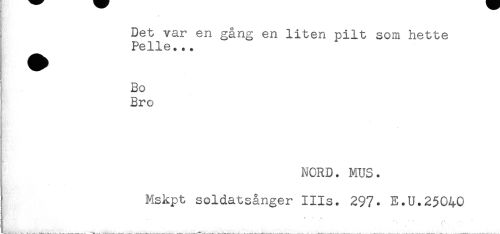 //// Det var en gång en liten pilt som hette //// ^ Pelle... //// Bo //// Bro //// NORD. MUS. //// Mskpt soldatsånger IIIs. 297. E.U.25040 //// ___^____ ////