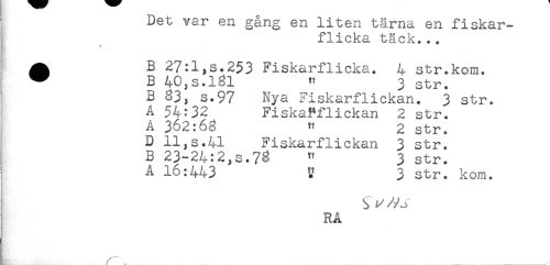 //// Det var en gång en liten tärna en fiskar- //// flicka täck... //// ^ B 27:1,s.253 Fiskarflicka. 4 str.kom. //// ^ B 40,s.181 " 3 str. //// B 83, s.97 Nya Fiskarflickan. 3 str. //// A 54:32 Fiskarflickan 2 str. //// A 362:68 " 2 str. //// D ll,s.41 Fiskarflickan 3 str. //// B 23-24:2,s.7^ " 3 str. //// A 16:443 V 3 str. kom. //// RA //// r*** . ... ___.<< ////