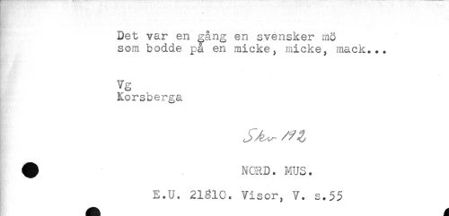 //// ' -- - ' //// Det var en ^ång en svensker mö //// som bodde på en micke, micke, mack... //// Vg //// Korsberga //// ^ NORD. MUS. //// E.U. 21610. Visor, V. s.55 ////