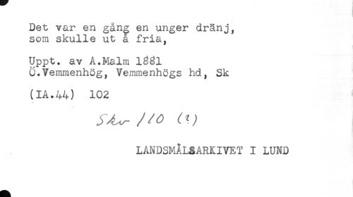//// Det var en gån^ en unger dränj, //// som skulle ut a fria, //// Uppt. av A.Malm 1681 //// Ö.Vemmenhög, Vemmenhögs hd, Sk //// (IA.44) 102 //// LANDSMÅLSARKIVET I LUND ////