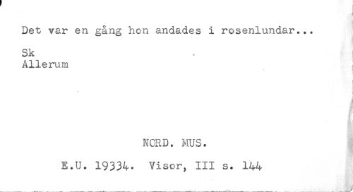 //// ' T //// Det var en gång hon andades i rosenlundar... //// Sk //// Allerum //// < //// % //// NORD. MUS. //// E.U. 19334. Visor, III s. 144 //// y ////