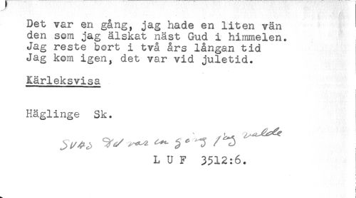 //// Det var en gång, jag hade en liten vän //// den som jag älskat näst Gud i himmelen. //// Jag reste bort i två års långan tid //// Jag kom igen, det var vid juletid. //// Kärleksvisa //// t //// Häglinge Sk. //// L U F 3512:6. //// ! //// < //// ! //// i ////