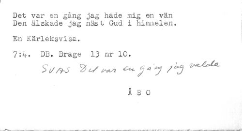 //// Det var en gång jag hade mig en vän //// Den älskade jag näst Gud i himmelen. //// En Kärleksvisa. //// 7:4^ DB. Brage 13 nr 10. //// ÅBO ////