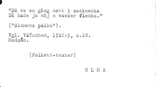 //// "Dä va en gång mett i socknecka //// Då hade ja mäj e vacker fleeka." //// ("Simiiiens palka"). //// t //// Vgl. VöTunhem, 1516:$, s.13. //// Madsen. //// (Polkett-texter) ////