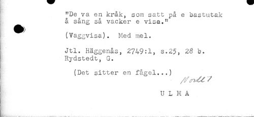 //// M-i //// "De va en kråk, som satt på e bastutak //// å sång så vacker e visa." //// (Vaggvisa). Med mel. //// Jtl. Håggenås, 2749:1, s.25, 28 b. //// Rydstedt, G. //// (Det sitter en fågel...) //// ^^ //// /U L M Å ////