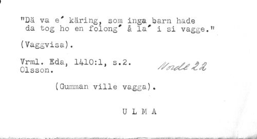 //// "Dä va e* käring, som inga barn hade //// da tog ho en folong* å la* i si vagge." //// (Vaggvisa). //// (Gumman ville vagga). //// U L M A ////