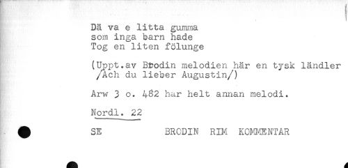 //// f, .... //// t //// Då va e litta gumma //// som inga barn hade //// Tog en liten fölunge //// (Uppt*av Btodin melodien hår en tysk ländier //// /Ach du lieber Augustin/) //// . //// Arw 3 o. 4^2 har helt annan melodi. //// Nordl. 22 //// SE BRODIN RIM KOMMENTAR ////